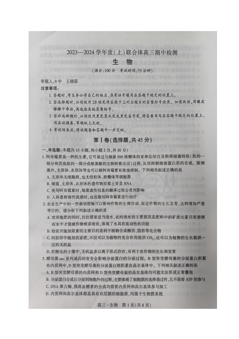 辽宁省沈阳市重点高中联合体2023-2024学年高三上学期期中考试 生物
