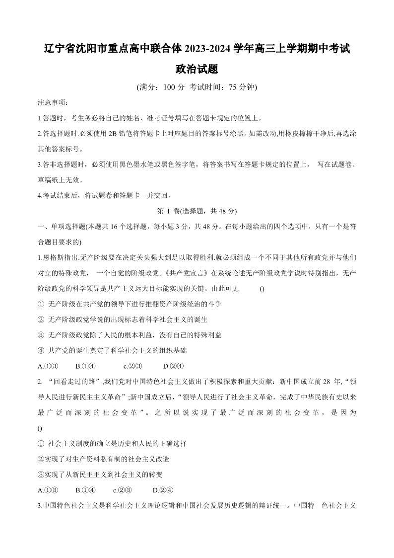 辽宁省沈阳市重点高中联合体2023-2024学年高三上学期期中考试 政治