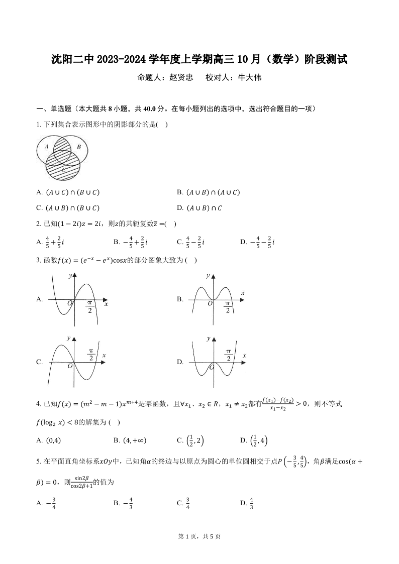 辽宁省沈阳市第二中学2023-2024学年高三上学期10月阶段测试 数学