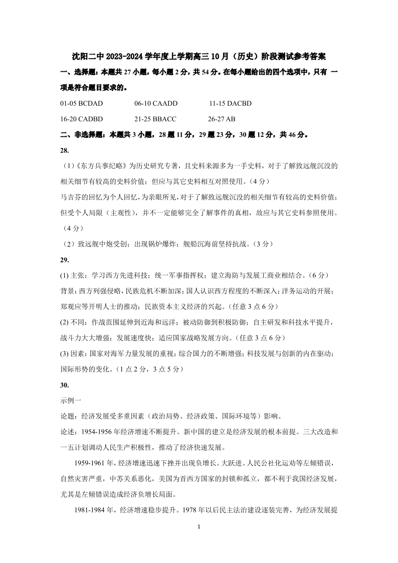 辽宁省沈阳市第二中学2023-2024学年高三上学期10月阶段测试 历史答案