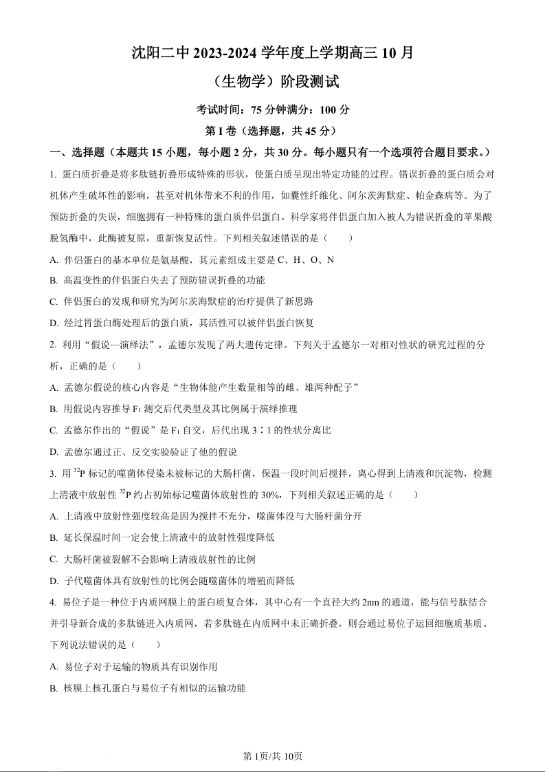 辽宁省沈阳市第二中学2023-2024学年高三上学期10月阶段测试 生物