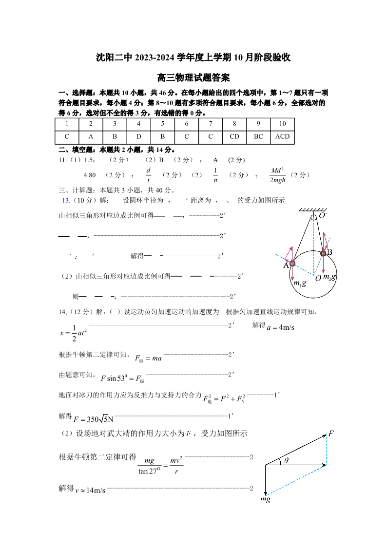 辽宁省沈阳市第二中学2023-2024学年高三上学期10月阶段测试 物理答案