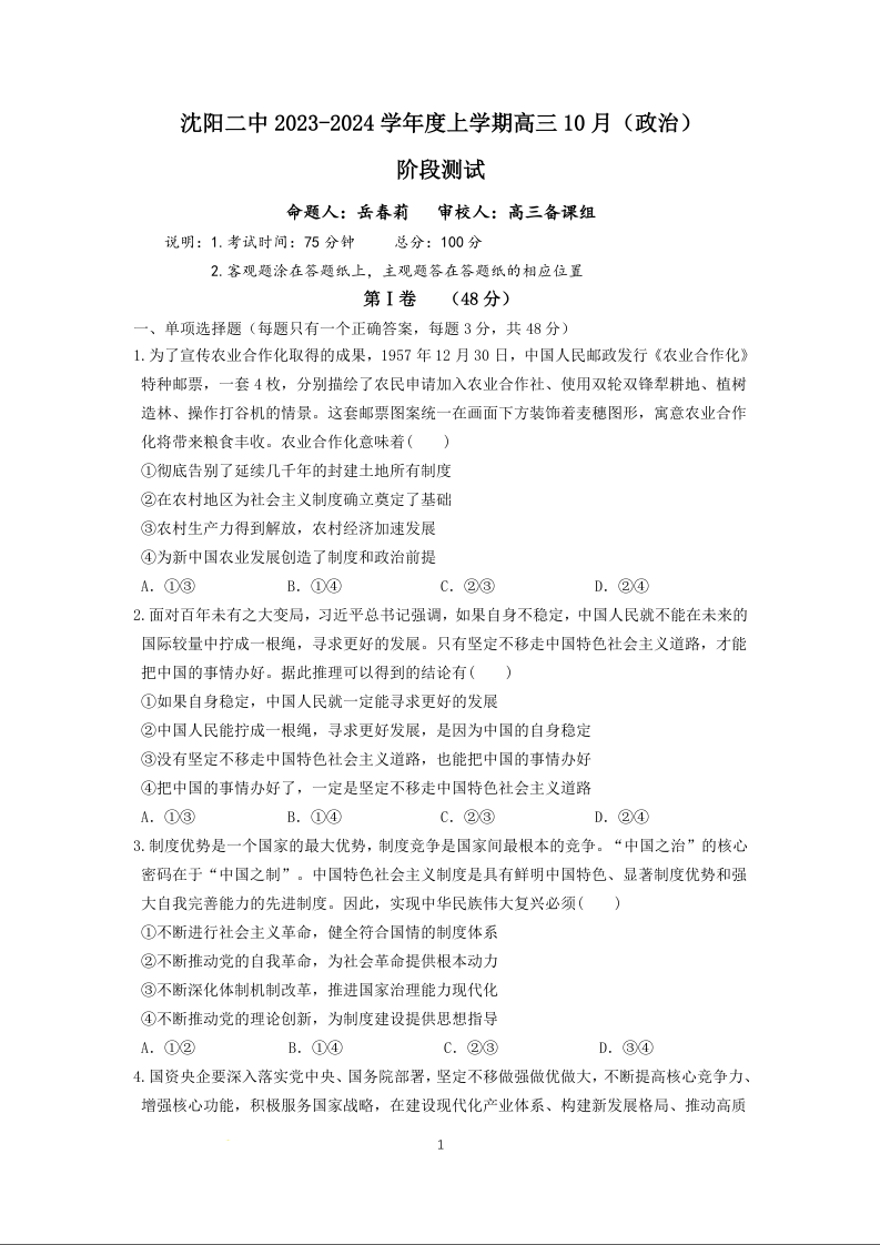 辽宁省沈阳市第二中学2023-2024学年高三上学期10月阶段测试 政治