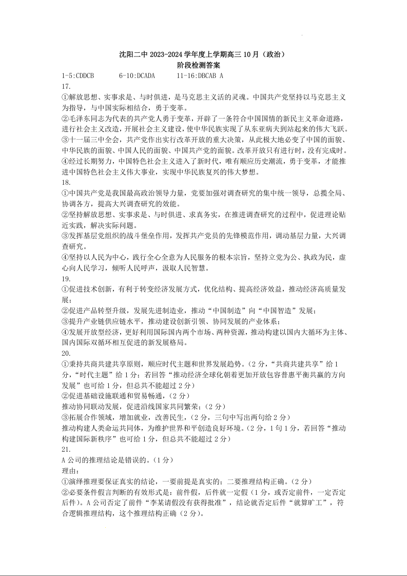 辽宁省沈阳市第二中学2023-2024学年高三上学期10月阶段测试 政治答案