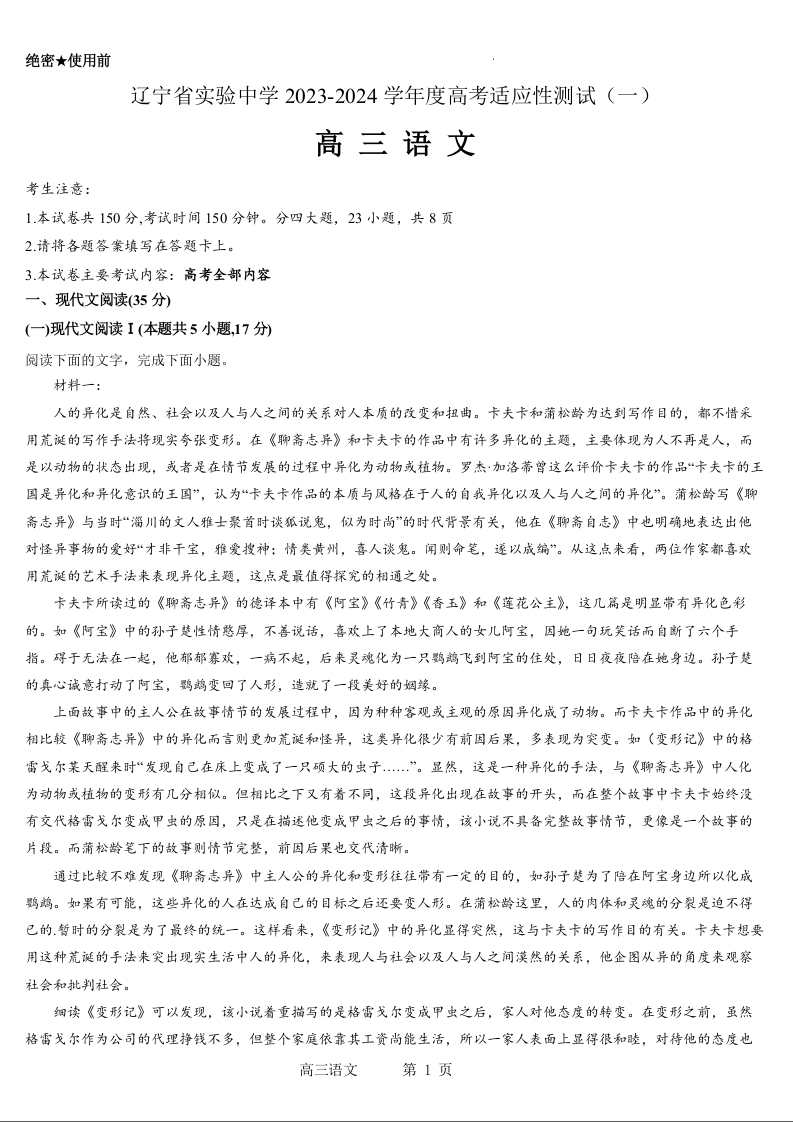 辽宁省实验中学2023-2024学年高三上学期高考适应性测试(一)语文