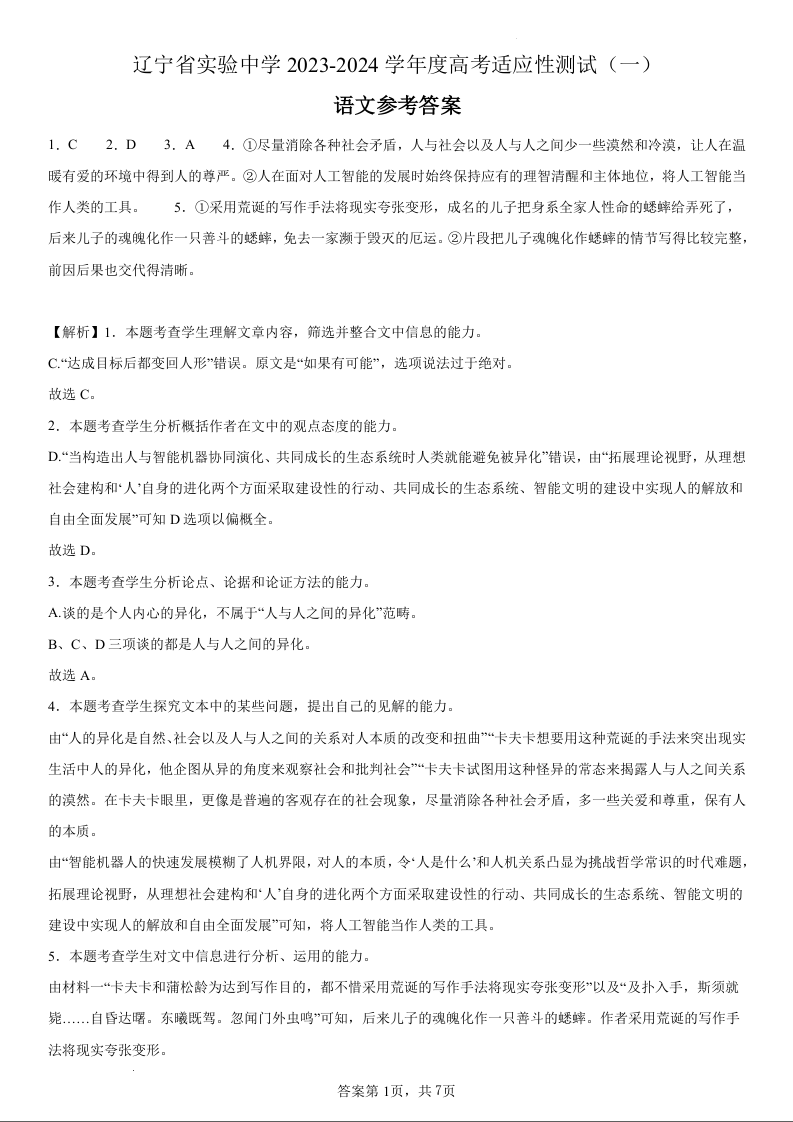 辽宁省实验中学2023-2024学年高三上学期高考适应性测试(一)语文参考答案
