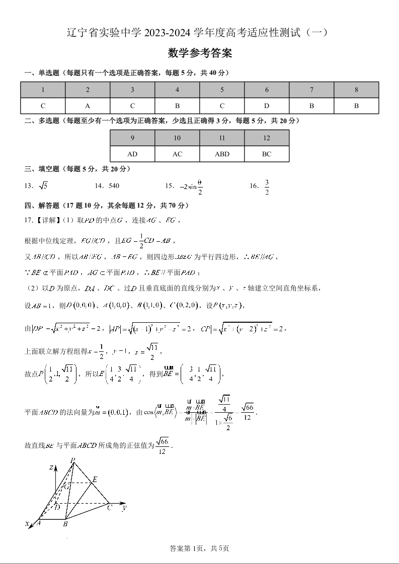辽宁省实验中学2023-2024学年高三上学期高考适应性测试(一)数学参考答案