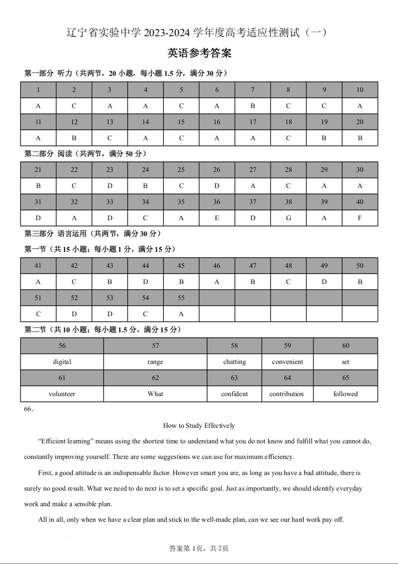 辽宁省实验中学2023-2024学年高三上学期高考适应性测试(一)英语参考答案