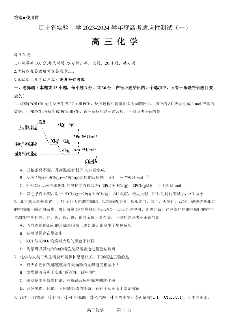 辽宁省实验中学2023-2024学年高三上学期高考适应性测试(一)化学