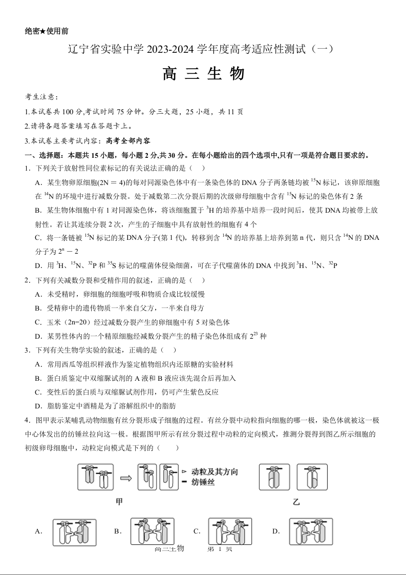 辽宁省实验中学2023-2024学年高三上学期高考适应性测试(一)生物