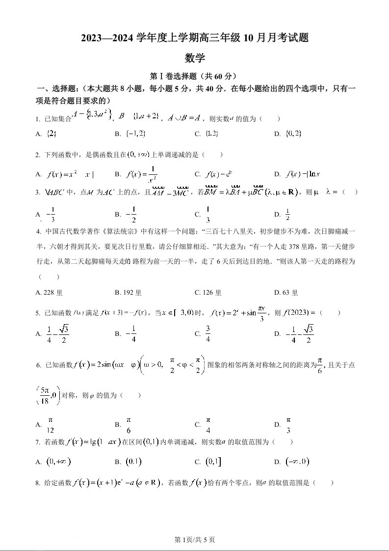 辽宁省重点高中沈阳市郊联体2023-2024学年高三上学期10月月考 数学
