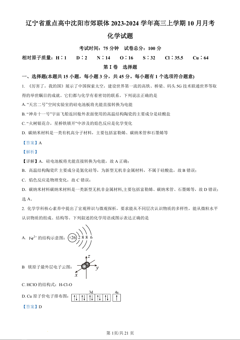 辽宁省重点高中沈阳市郊联体2023-2024学年高三上学期10月月考 化学答案
