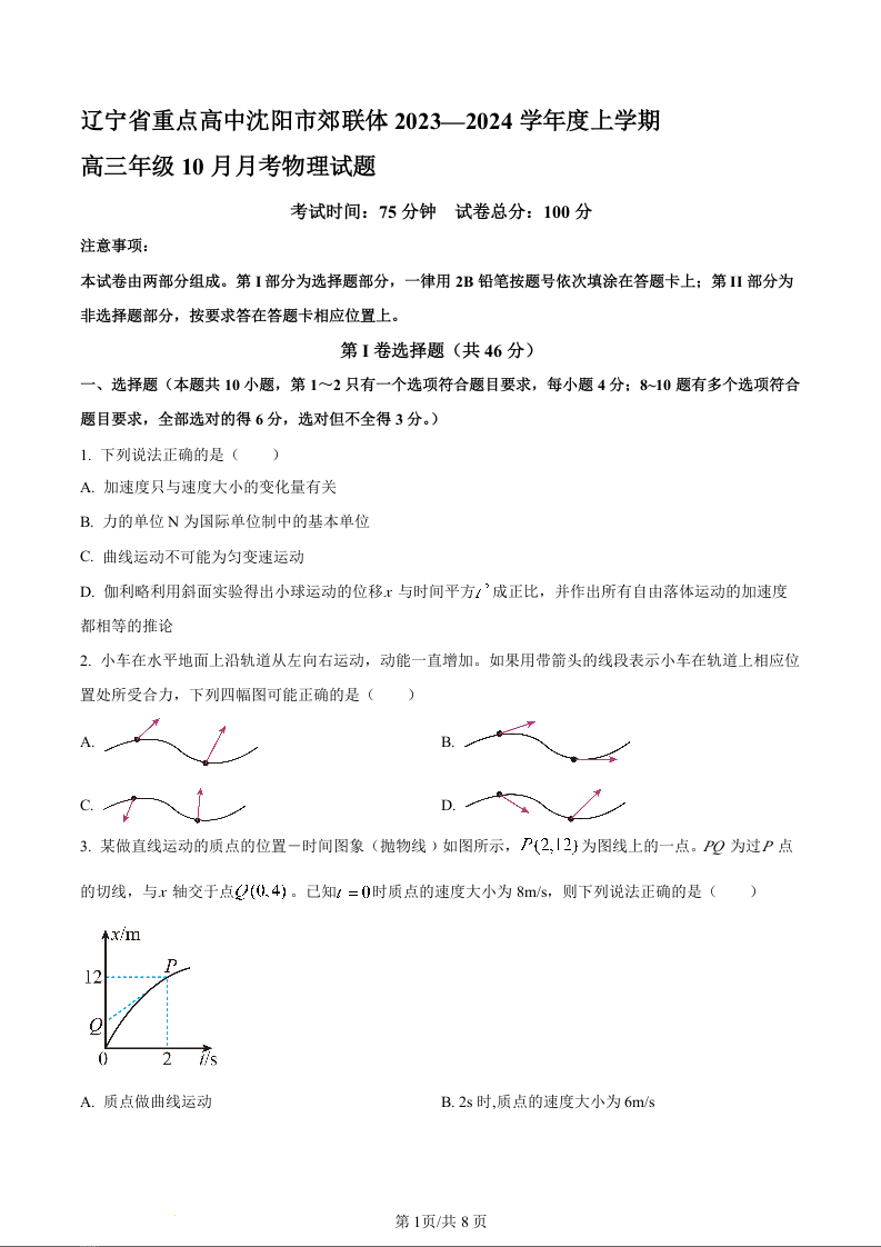 辽宁省重点高中沈阳市郊联体2023-2024学年高三上学期10月月考 物理