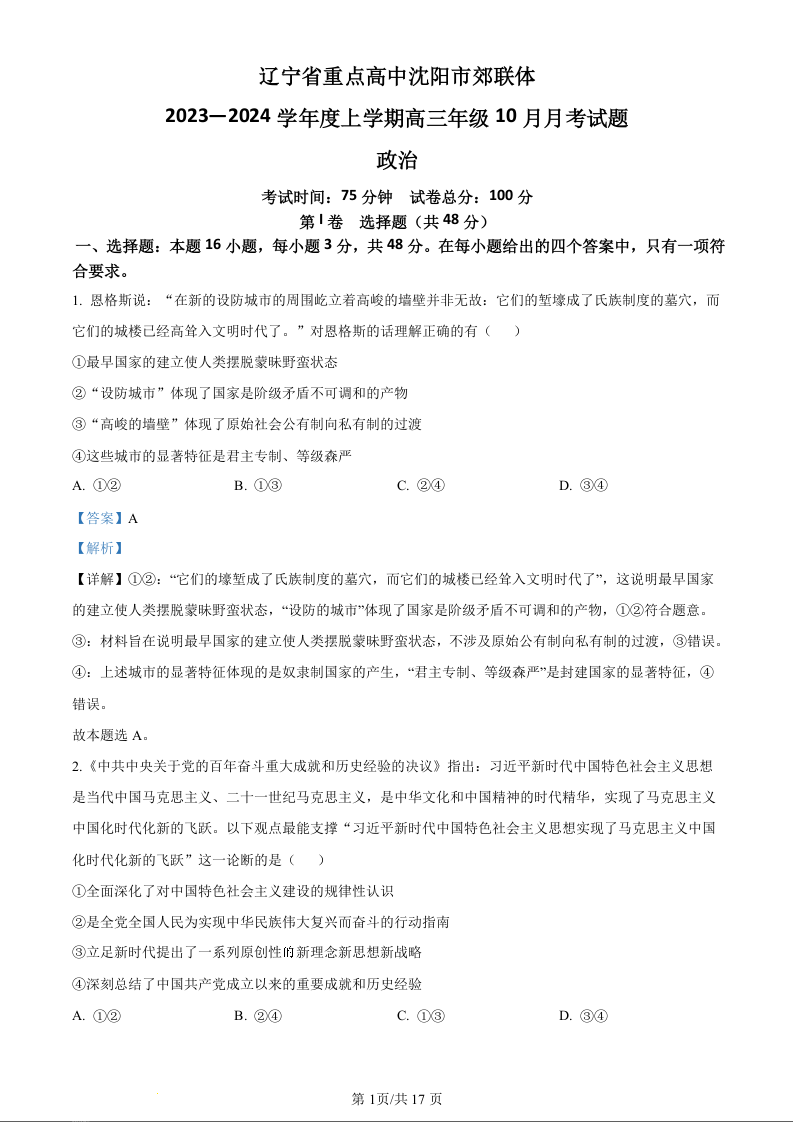 辽宁省重点高中沈阳市郊联体2023-2024学年高三上学期10月月考 政治答案