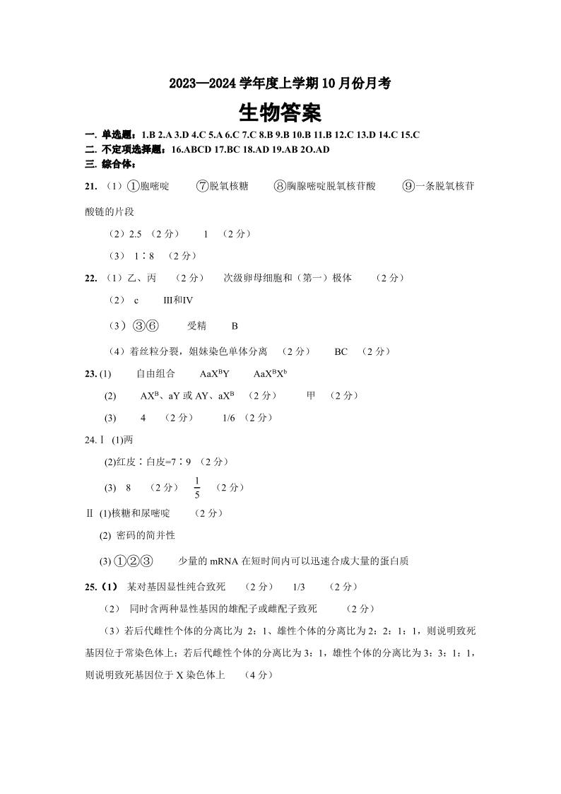 辽宁省新民市高级中学2023-2024学年高三10月月考 生物答案