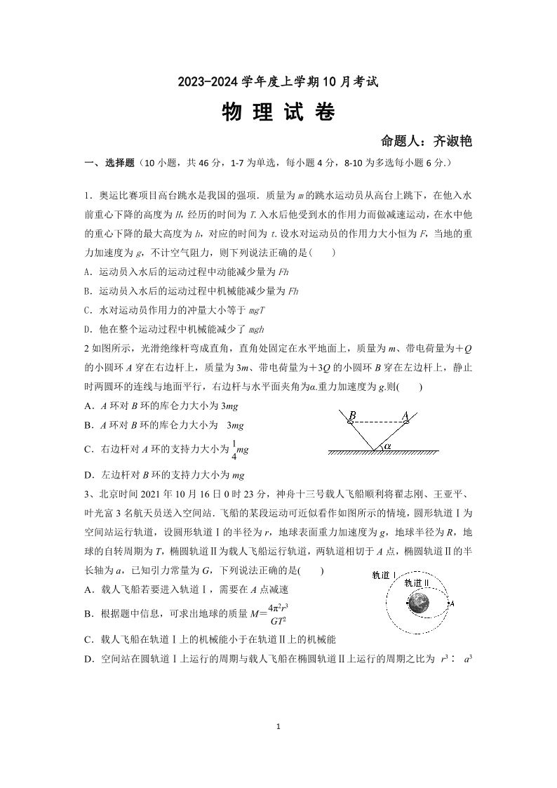 辽宁省新民市高级中学2023-2024学年高三10月月考 物理