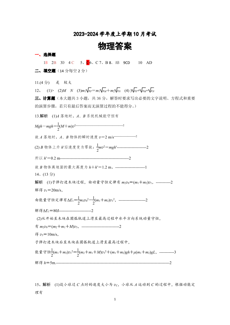 辽宁省新民市高级中学2023-2024学年高三10月月考 物理答案
