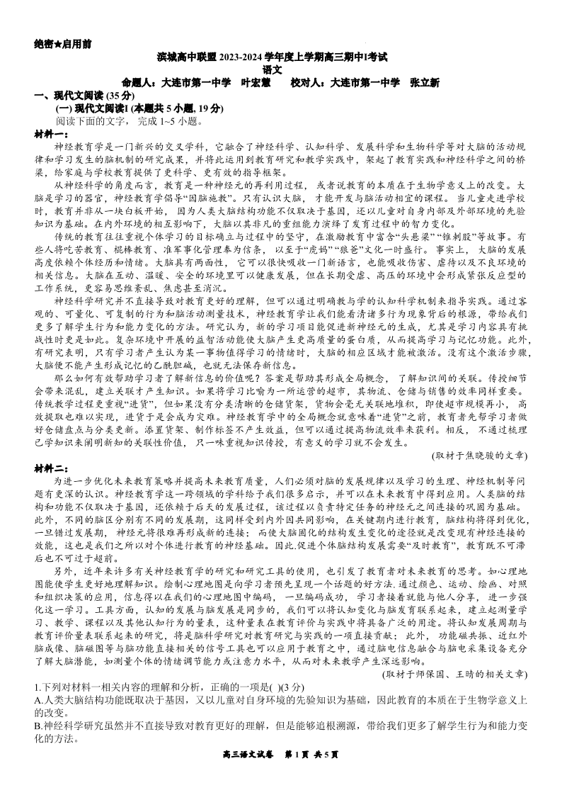 辽宁省大连市滨城高中联盟2023-2024学年高三上学期期中(Ⅰ)考试 语文