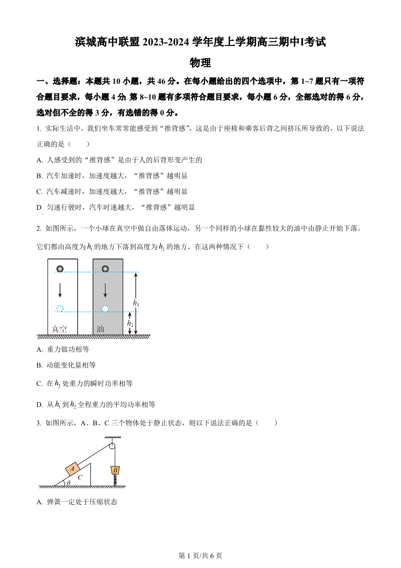 辽宁省大连市滨城高中联盟2023-2024学年高三上学期期中(Ⅰ)考试 物理