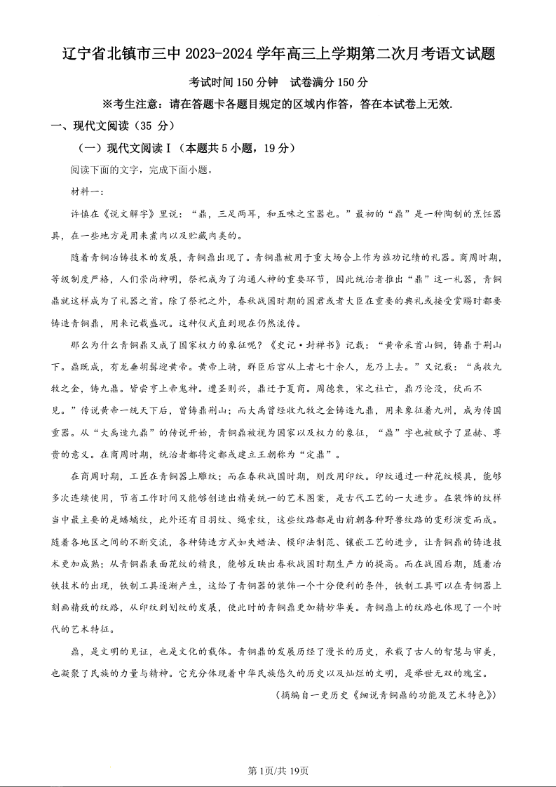 辽宁省北镇市第三高级中学2024届高三上学期第二次月考 语文答案