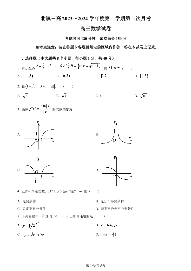 辽宁省北镇市第三高级中学2024届高三上学期第二次月考 数学