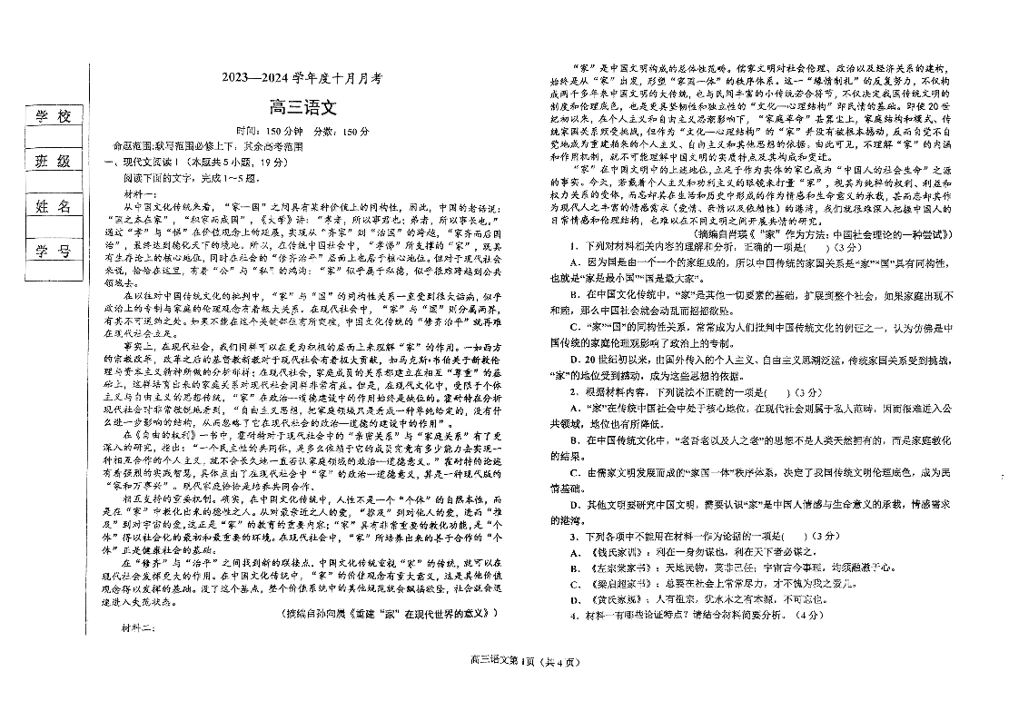 辽宁省鞍山市普通高中2023-2024学年高三上学期10月月考 语文