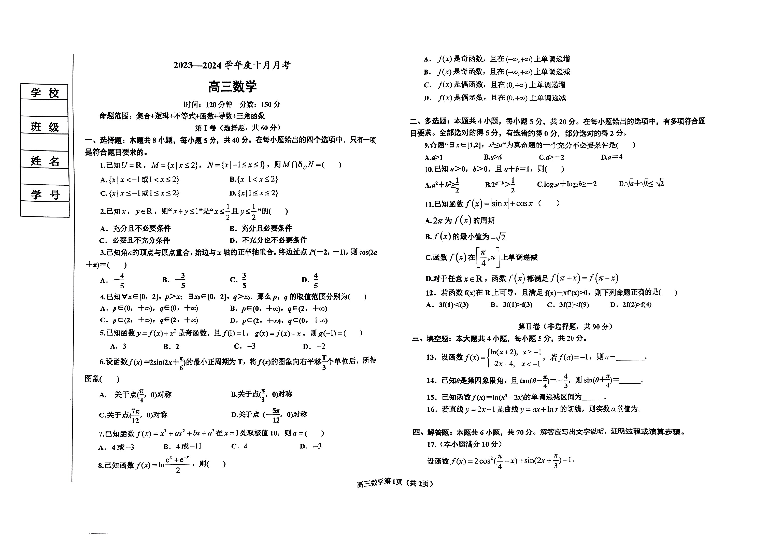 辽宁省鞍山市普通高中2023-2024学年高三上学期10月月考 数学