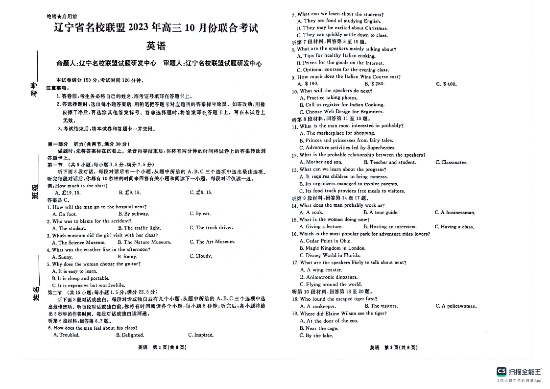 辽宁省名校联盟2023-2024学年高三上学期10月联考 英语