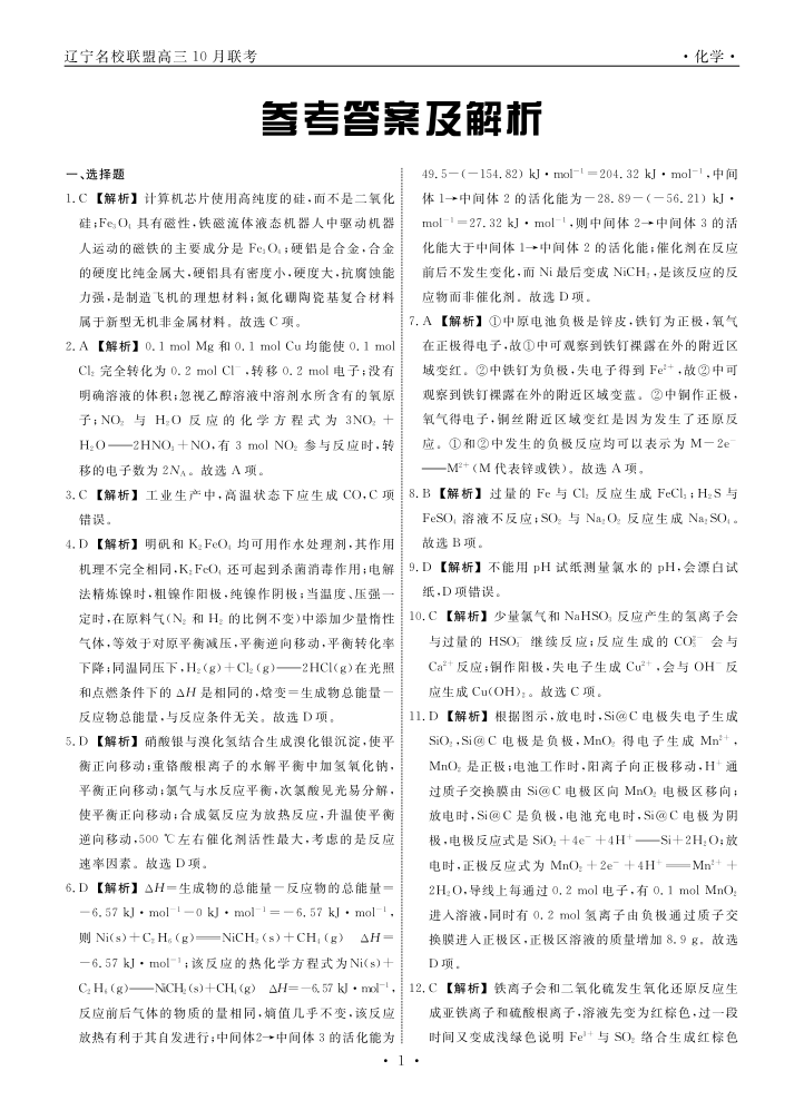 辽宁省名校联盟2023-2024学年高三上学期10月联考 化学答案