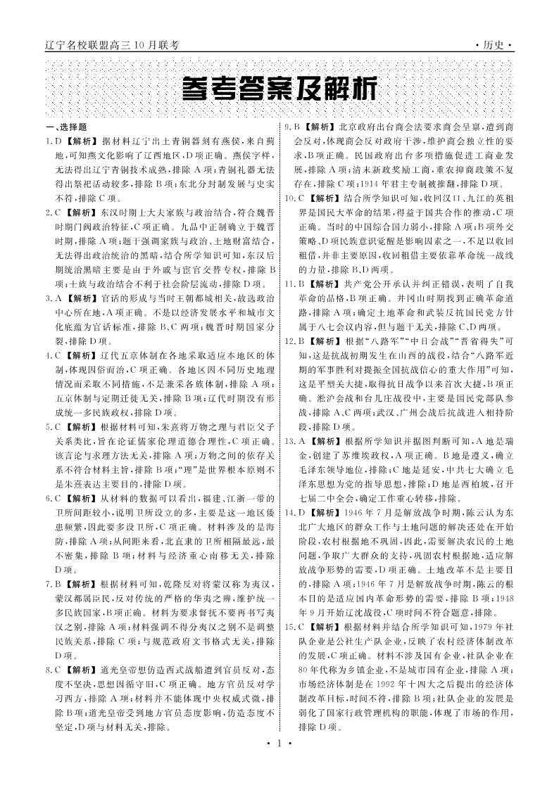 辽宁省名校联盟2023-2024学年高三上学期10月联考 历史答案