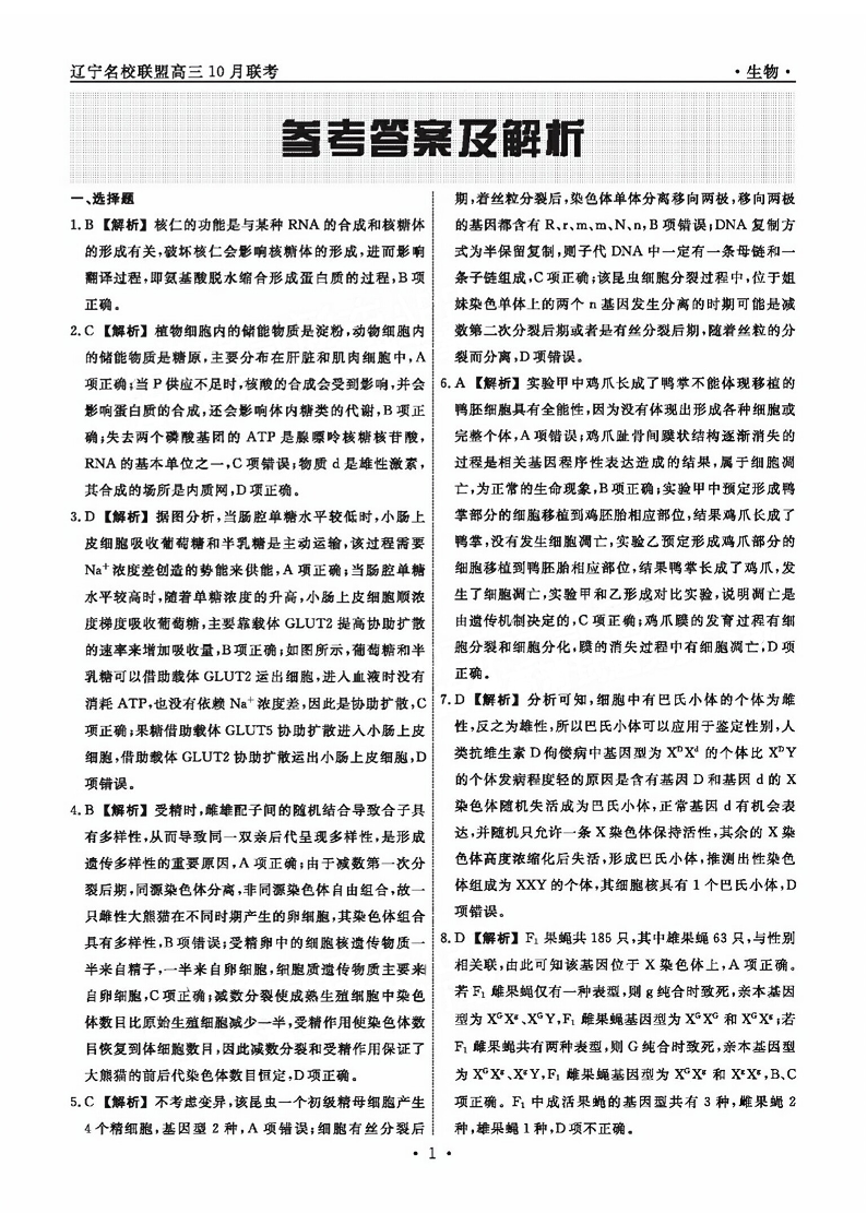 辽宁省名校联盟2023-2024学年高三上学期10月联考 生物答案