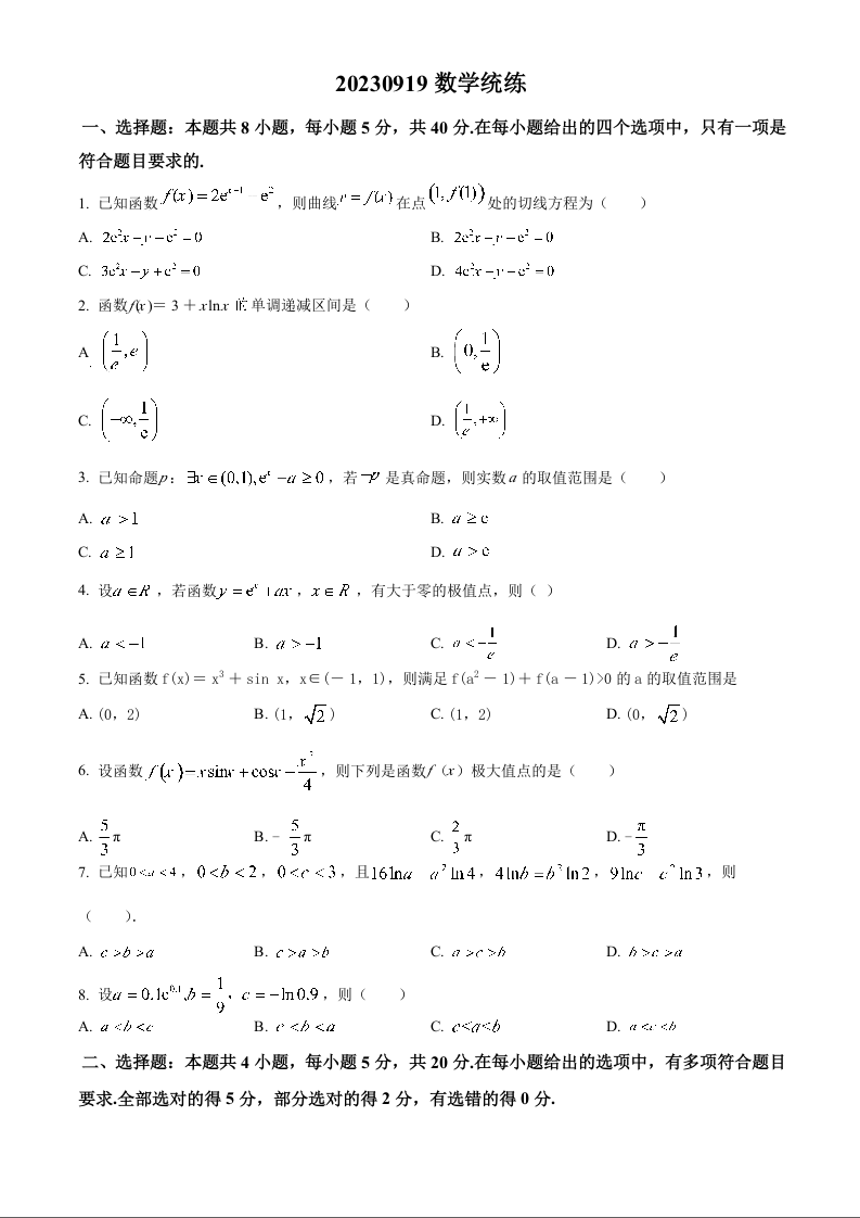 辽宁省大连市第八中学2023-2024学年高三上学期9月月考 数学