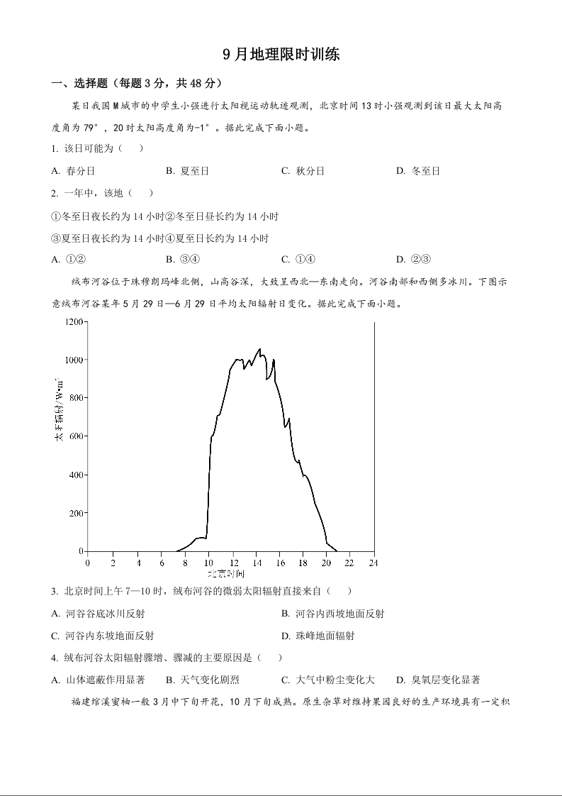 辽宁省大连市第八中学2023-2024学年高三上学期9月月考 地理