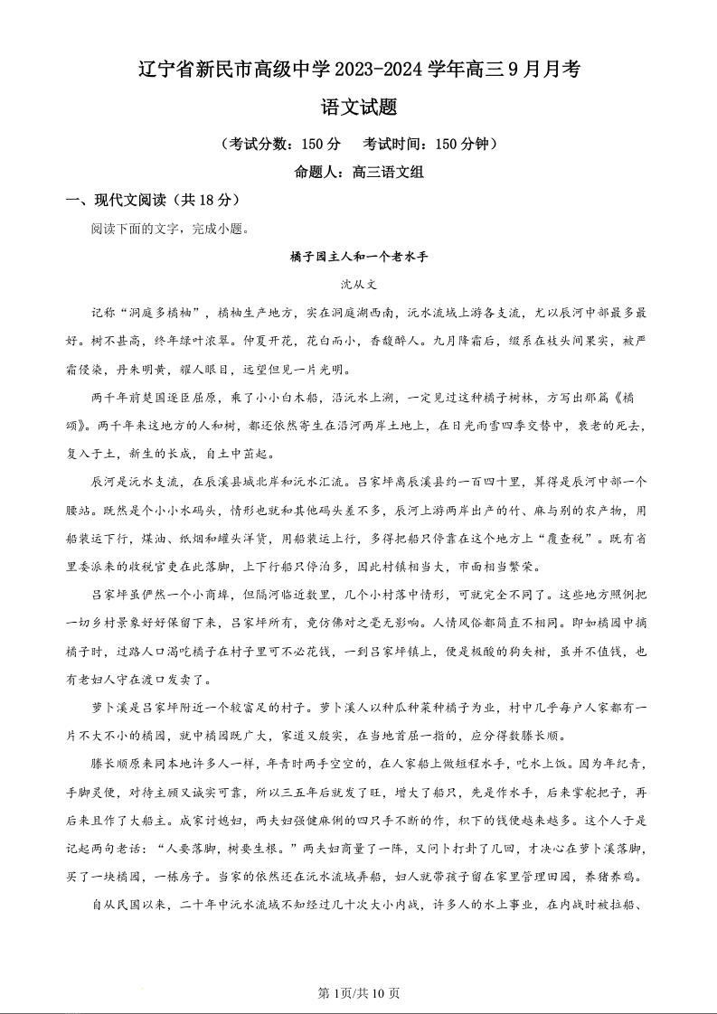 辽宁省沈阳市新民市高级中学2023-2024学年高三上学期9月开学考试 语文