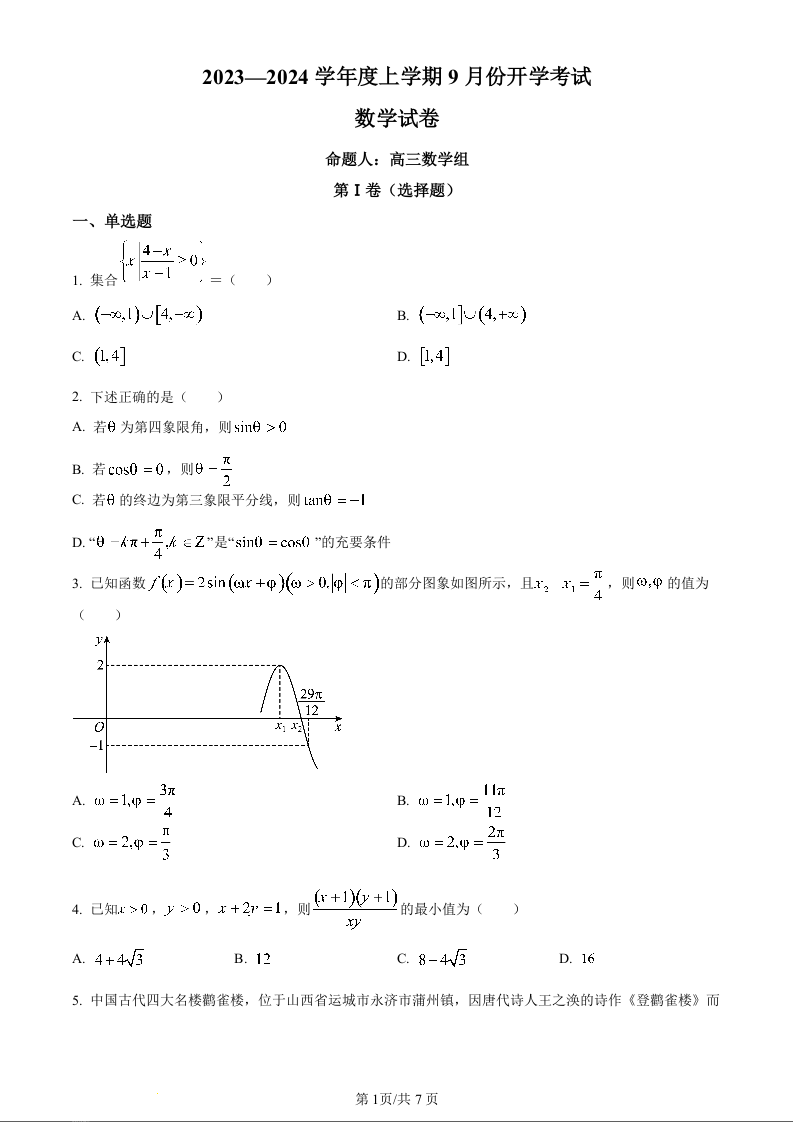 辽宁省沈阳市新民市高级中学2023-2024学年高三上学期9月开学考试 数学
