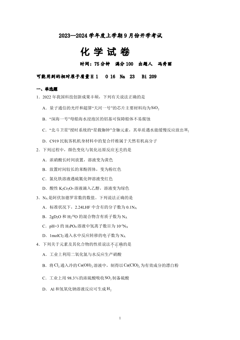 辽宁省沈阳市新民市高级中学2023-2024学年高三上学期9月开学考试 化学