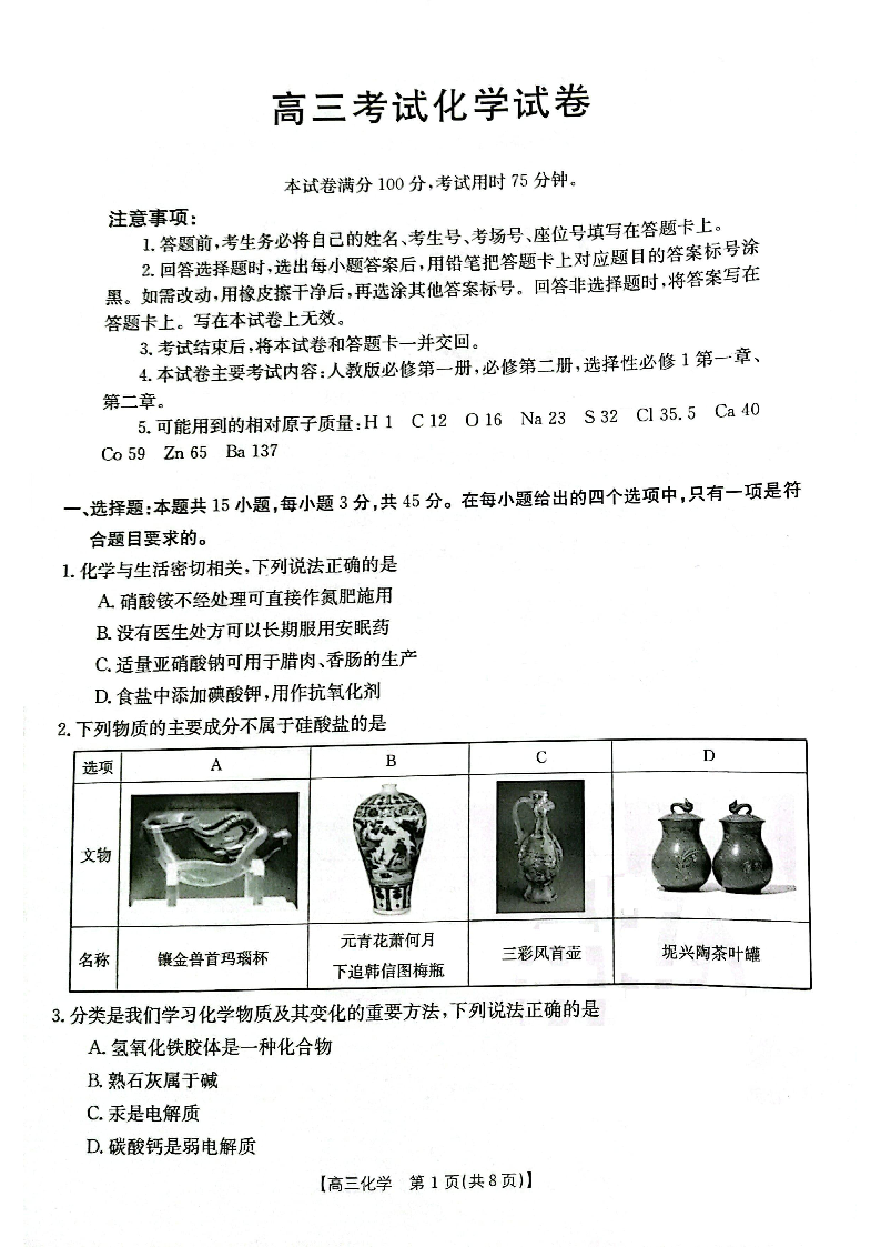 辽宁省部分高中2023-2024学年高三上学期10月月考 化学