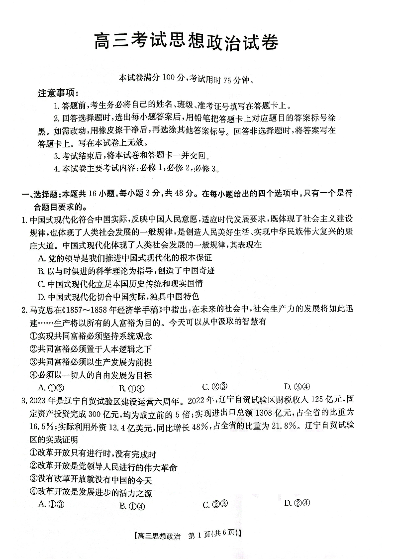 辽宁省部分高中2023-2024学年高三上学期10月月考 政治