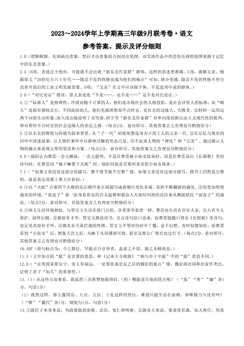 辽宁省名校协作体2023-2024学年高三上学期9月联考 语文答案