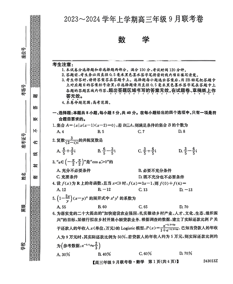 辽宁省名校协作体2023-2024学年高三上学期9月联考 数学