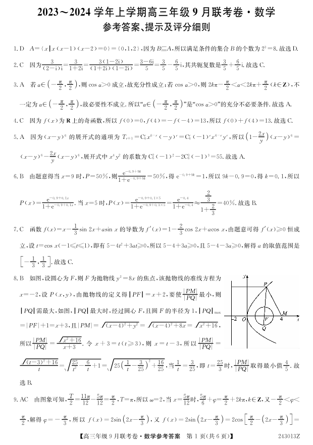 辽宁省名校协作体2023-2024学年高三上学期9月联考 数学答案