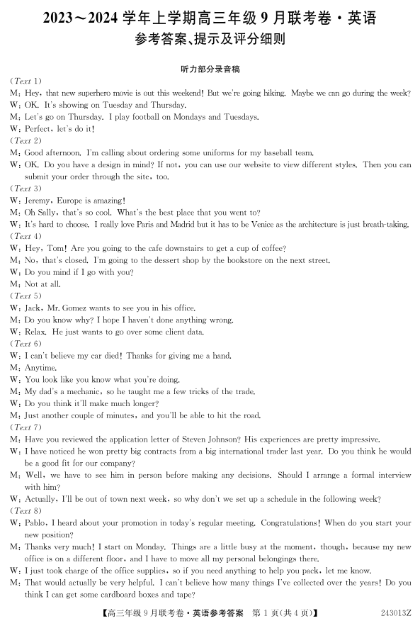 辽宁省名校协作体2023-2024学年高三上学期9月联考 英语答案