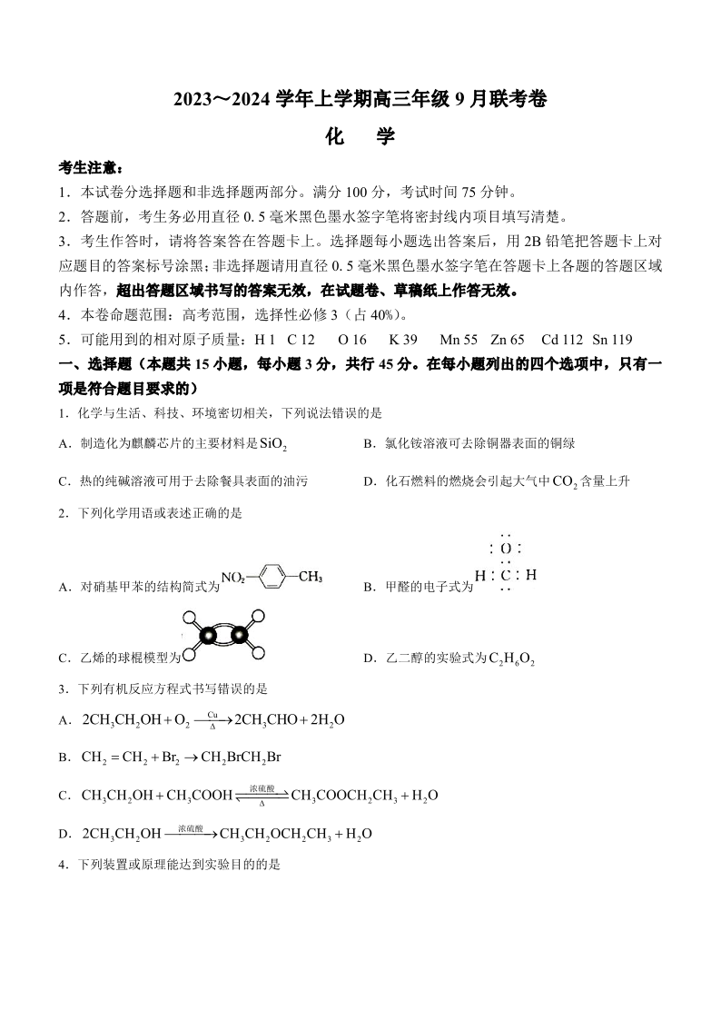 辽宁省名校协作体2023-2024学年高三上学期9月联考 化学