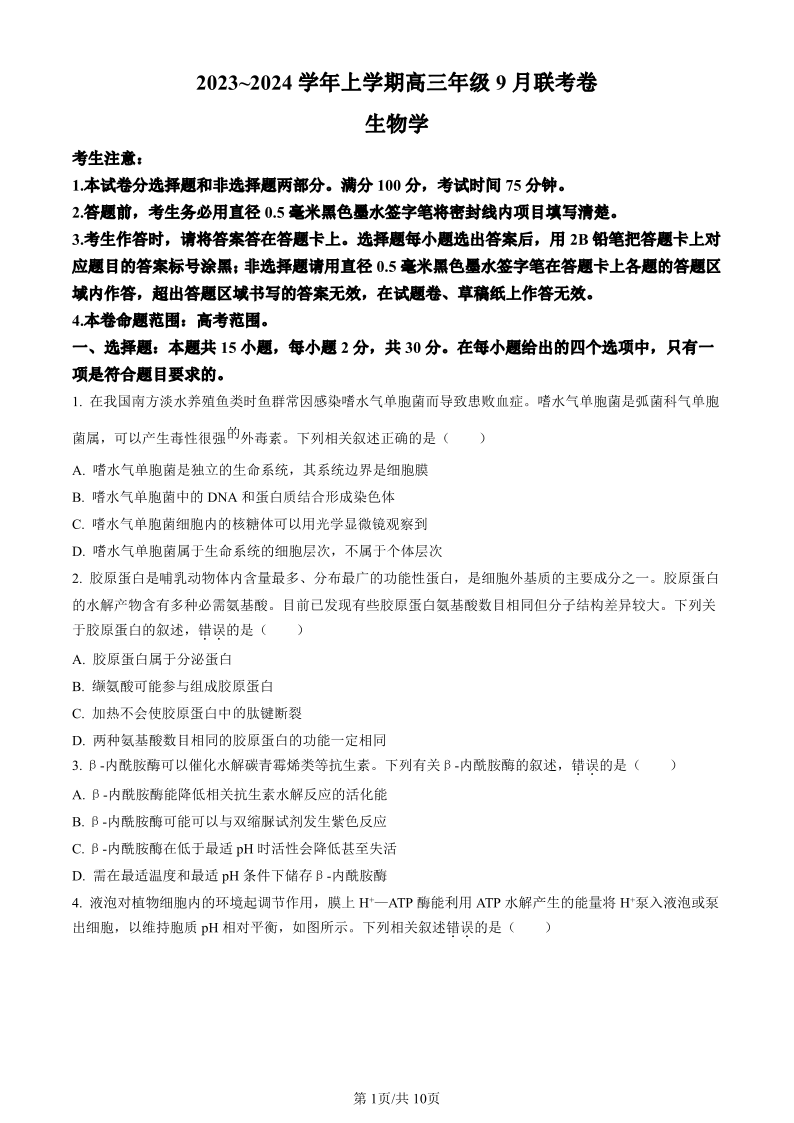 辽宁省名校协作体2023-2024学年高三上学期9月联考 生物