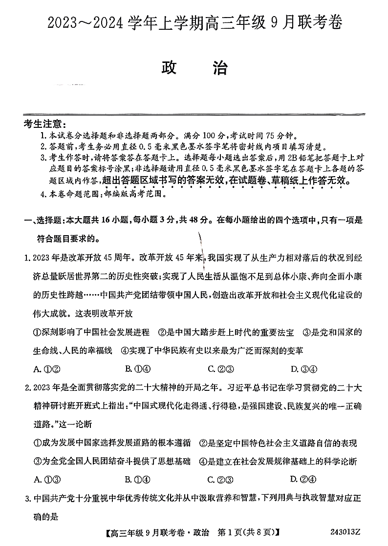 辽宁省名校协作体2023-2024学年高三上学期9月联考 政治
