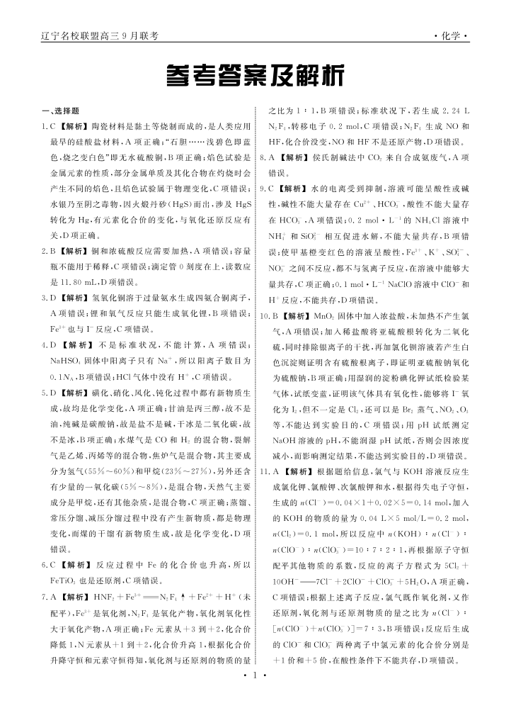 辽宁省名校联盟2023-2024学年高三上学期9月联考 化学答案