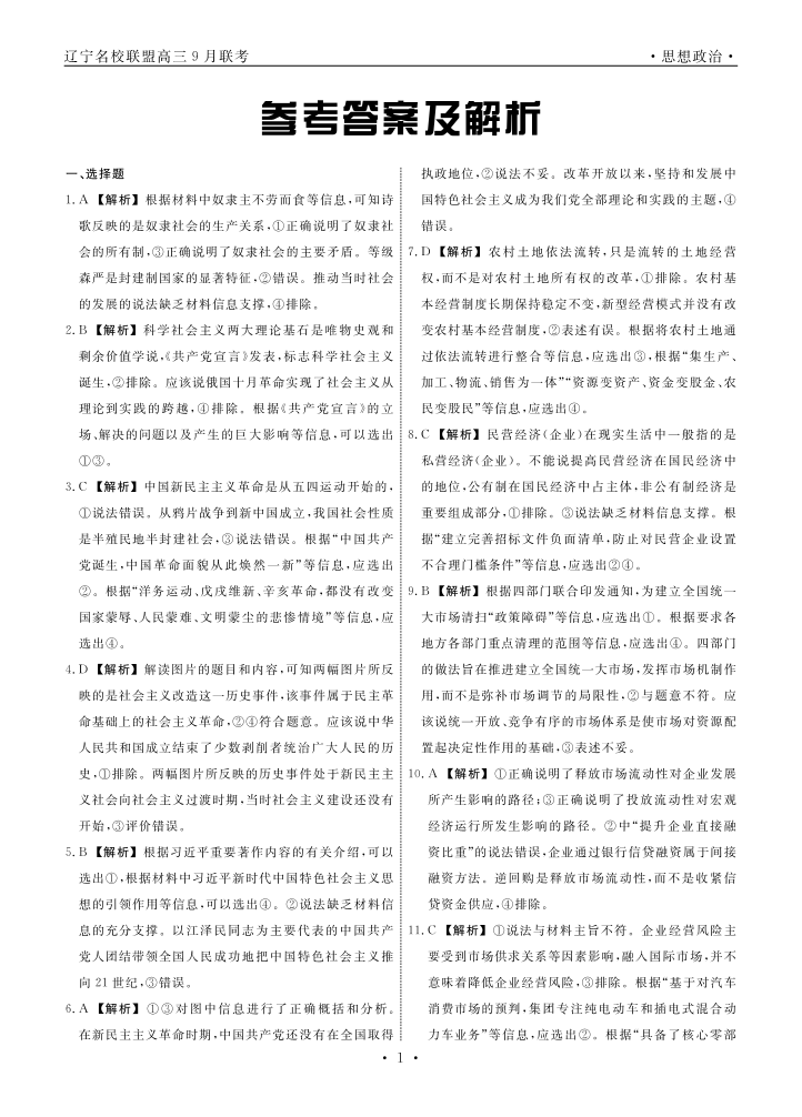 辽宁省名校联盟2023-2024学年高三上学期9月联考 政治答案