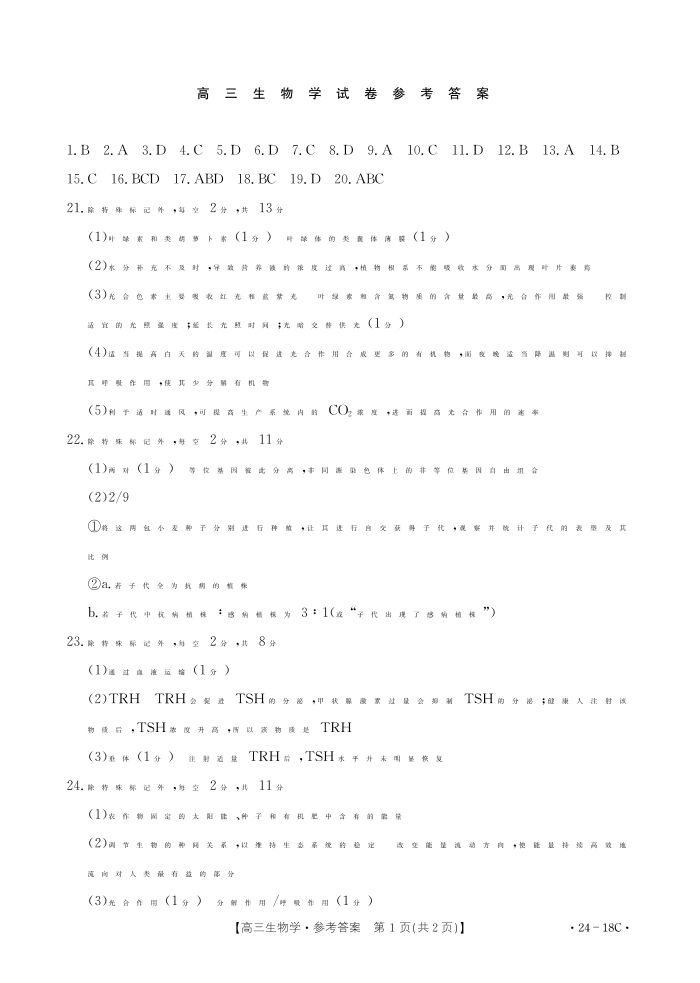 辽宁省部分学校2023-2024学年高三开学摸底考试 生物答案