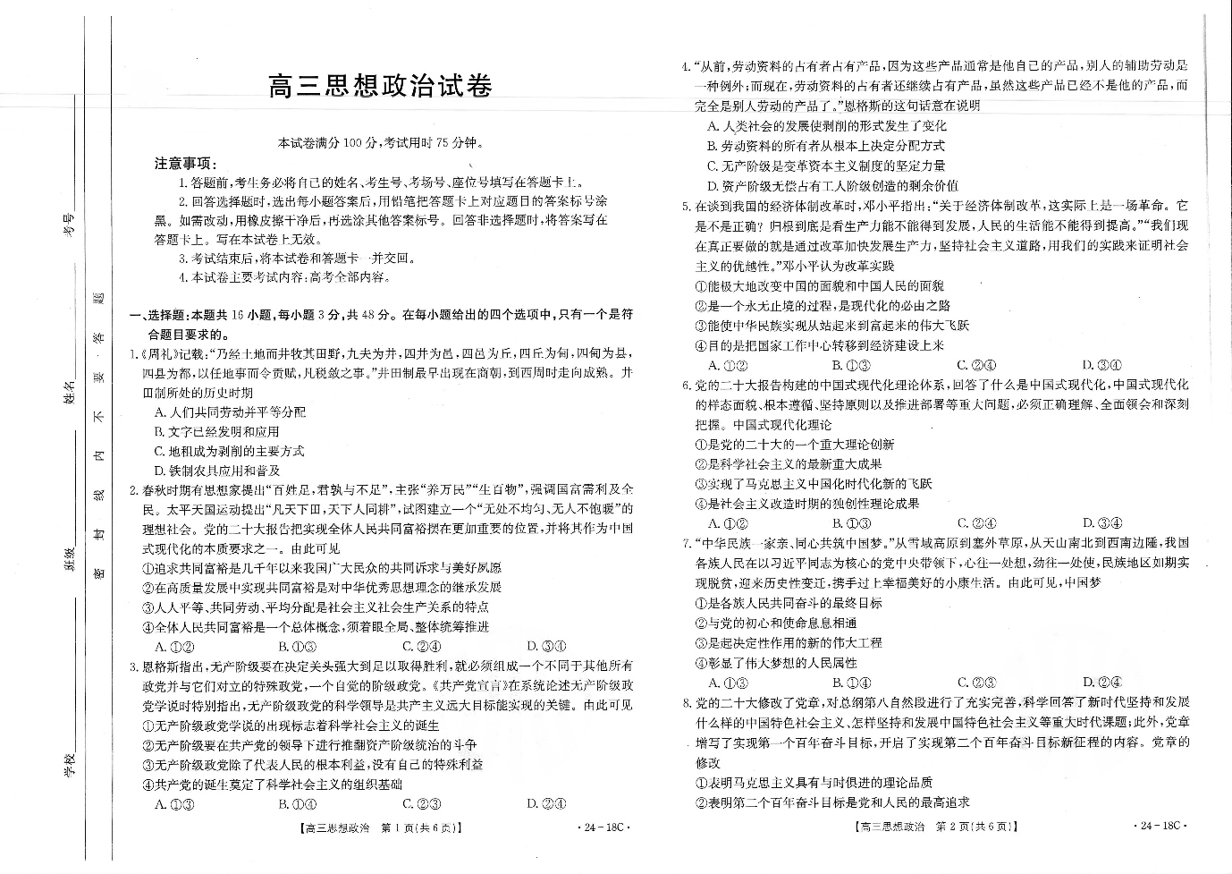 辽宁省部分学校2023-2024学年高三开学摸底考试 政治