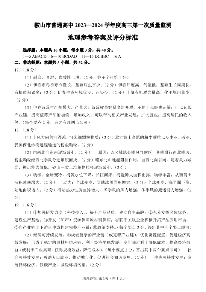 辽宁省鞍山市2023-2024学年高三上学期第一次质量监测 地理答案
